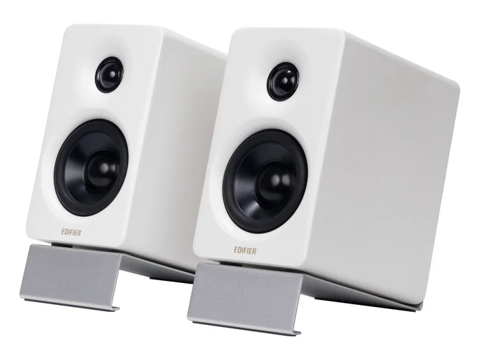 Connectivity is made effortless with the M60, featuring rear-mounted USB-C and AUX inputs for easy integration with computers and turntables. Additionally, the inclusion of Bluetooth connectivity allows for wireless streaming, providing versatility for modern audio setups. The package also comes with exclusive aluminium speaker stands designed to minimize sound coloration from desktop surfaces, ensuring optimal audio performance. With a thoughtful 15-degree angle, these stands direct sound precisely at ear level, enhancing the listening experience. The top-mounted touch panel, equipped with an automatic backlight, offers intuitive control, allowing users to adjust settings with a simple touch or swipe, making the Edifier M60 a sophisticated yet user-friendly addition to any audio setup.