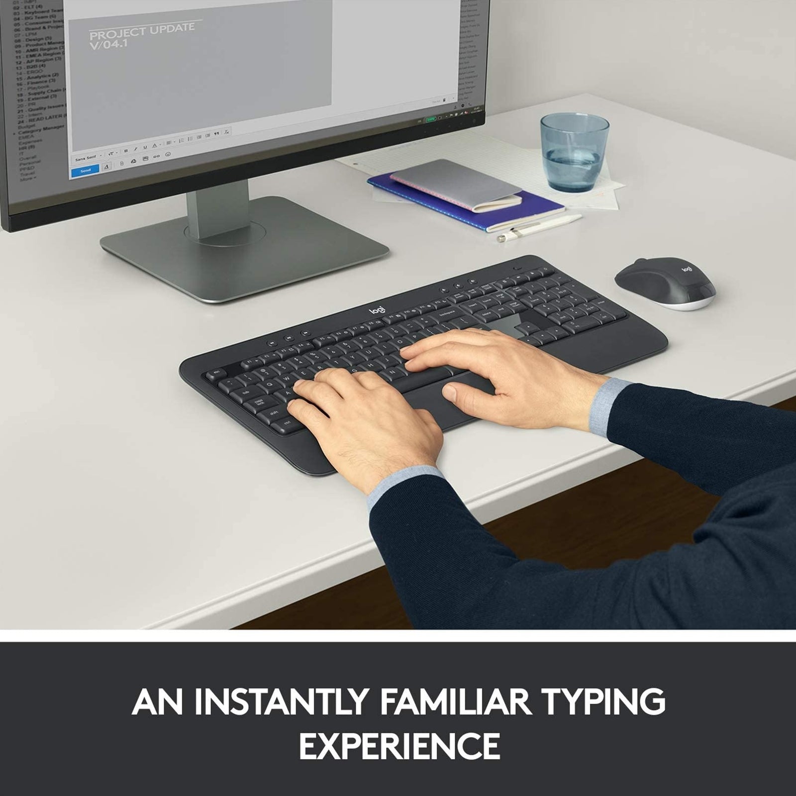 The MK540 Advanced is an instantly familiar wireless keyboard and mouse combo built for precision, comfort, and reliability. The full-size keyboard features a familiar key shape, size, and feeling – and the contoured and ambidextrous mouse has been designed to fit comfortably into either palm.